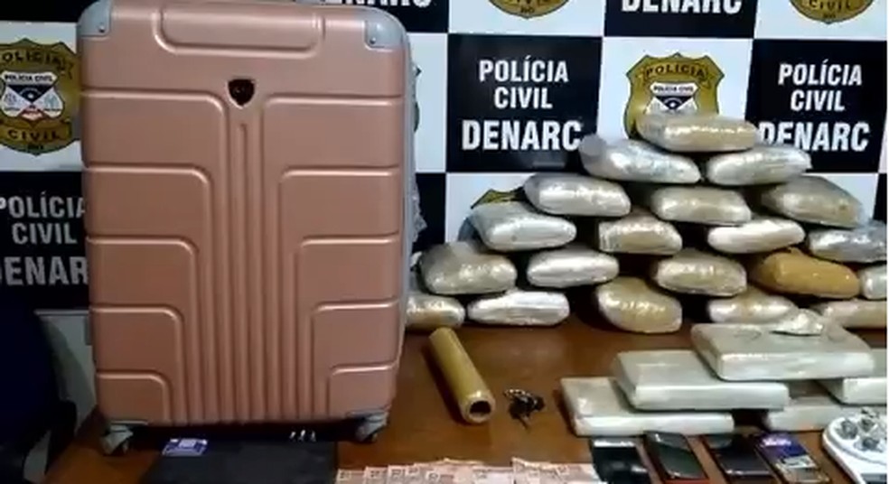O entorpecente estava embalado com plástico e transportado dentro de malas de viagem. Também foram apreendidos dinheiro, celulares e balança de precisão.